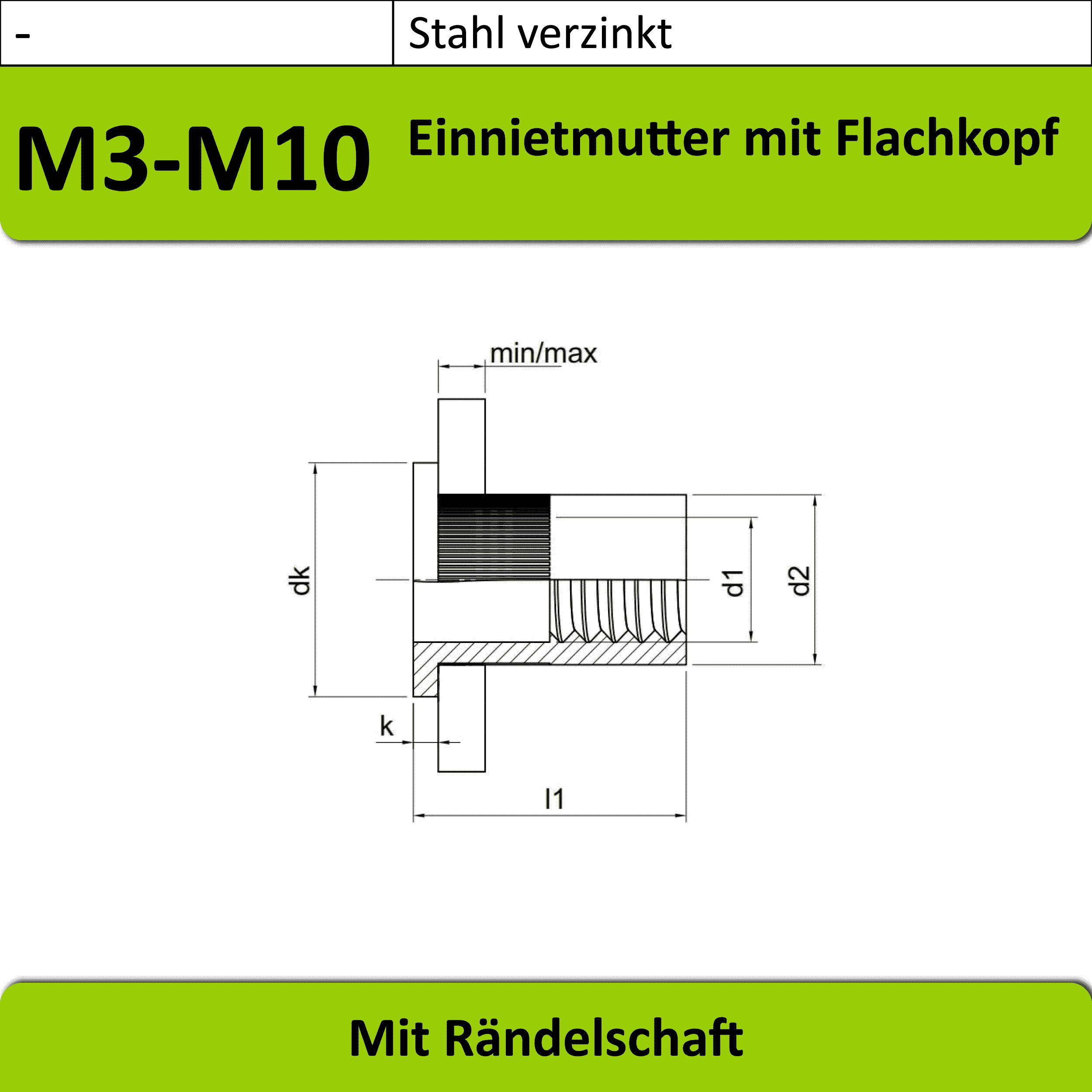 Produktinformationen "Einnietmutter mit Flachkopf und Schafträndelung Stahl verzinkt M4"